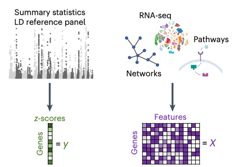 getMarkerStat() — retrieve GWAS summary statistics (Y’s)getFeatureStat() — extract gene-, protein-, or pathway-level results (Y’s)getMarkerSets()— define biological groupings (basis for X’s)designMatrix() — build feature matrices (X) linking variants or genes to biological feature sets\[ \mathbf{Y} = \mathbf{X}\boldsymbol{\beta} + \boldsymbol{\epsilon} \]